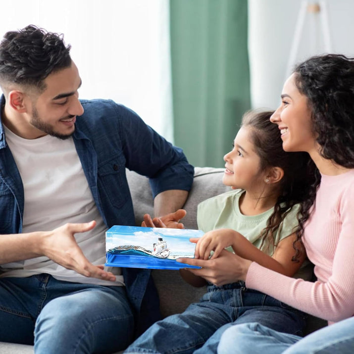 The Fluid Drift Model Ship is crafted from high-quality acrylic for crystal clarity, while the ship itself is made of durable resin. The integrated seawater consists of pure water and vegetable oil, ensuring a mesmerizing fluid experience without risk of sinking.